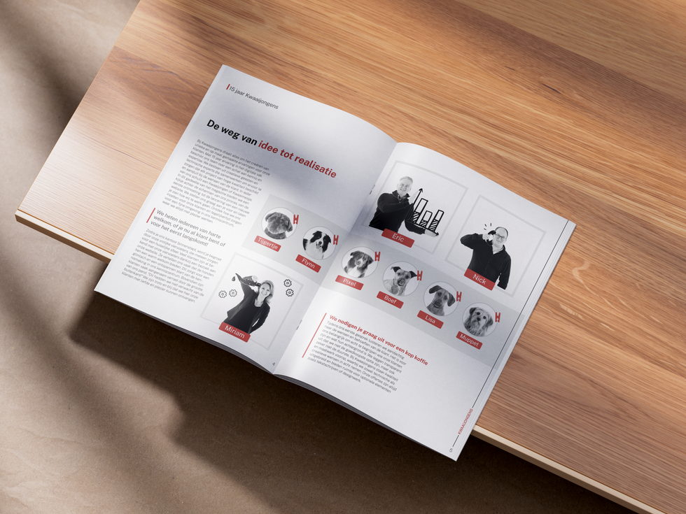 Kwaaijongens is een creatief en persoonlijk WordPress-internetbureau uit het kleine dorpje Zeeland in Brabant, met een full-service aanpak en een passie voor alles wat online mogelijk is. Hun onderscheidende merkstijl, speelse werksfeer en de viervoeters die al jaren vrij over het kantoor lopen maken het bureau uniek. Het ontwerp van het jubileummagazine speelt met de kenmerkende rode huisstijl en combineert strakke, nuchtere layouts met subtiele, speelse details. Zo vormt het magazine een visuele viering van 15 jaar creativiteit, karakter en energie.